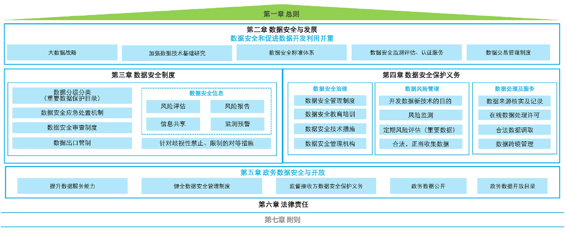 如图所示,数安法从数据安全与开展,安全制度,安全保护义务,政务数据安全与开放四大领域结合整体数字经济的开展提出了开展与安全并重的具体要求。