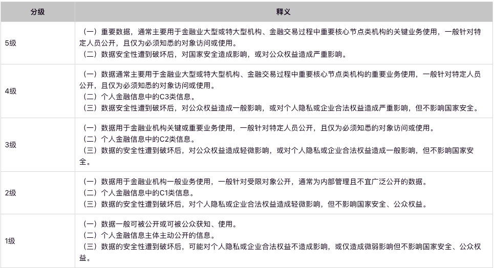 本标准根据⾦融业组织数据安全性遭受破坏后的影响对象和所造成的影响程度,将数据安全级别从⾼到低划分为5级、4级、3级、2级、1级。