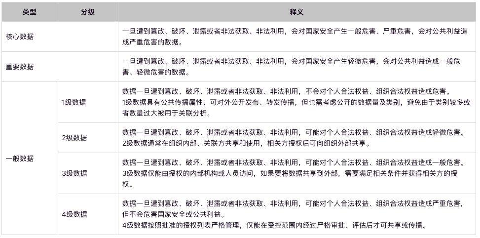 按照该指引,数据可以分为核⼼数据、重要数据及⼀般数据。按照数据⼀旦遭到篡改、破坏、泄露或者⾮法获取、⾮法利⽤,对个⼈、组织合法权益造成的危害程度,将⼀般数据从低到⾼分为1级、2级、3级、4级共四个级别。