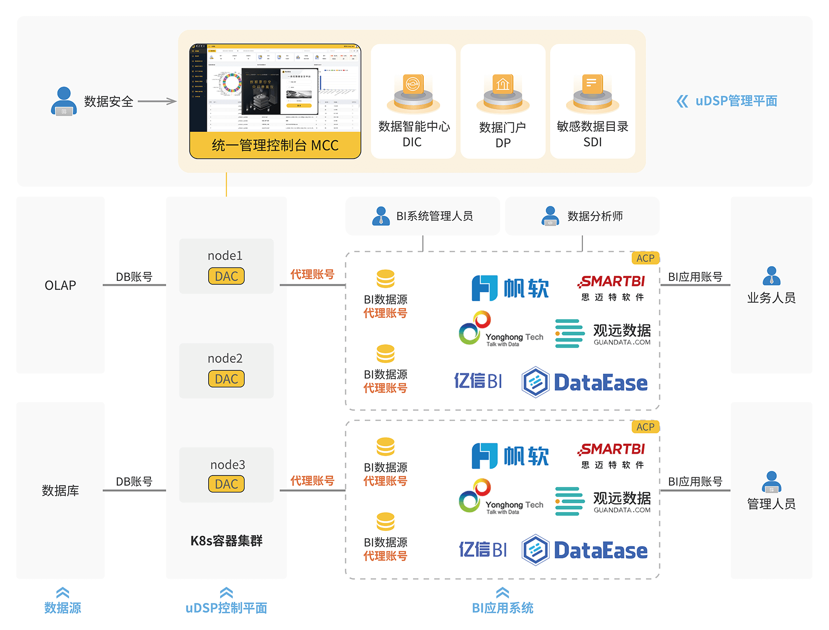 Ebpay一体化数据安全平台 uDSP 针对 BI 数据分析场景的业务和技术特点,采取“贴源保护”的技术思路,部署在 BI 应用系统和数据源中间,解耦数据安全与数据业务,给予一体化协同的敏感数据保护能力。